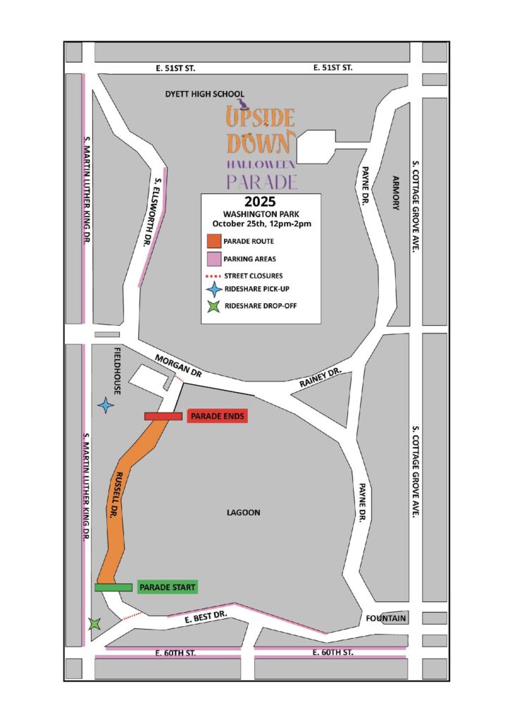 The event will take place on Saturday, October 25th, from 12-2pm in Washington Park! The Upside Down Halloween Parade is a free family-friendly event that is part of Mayor Brandon Johnson’s Fall Fest 2025!